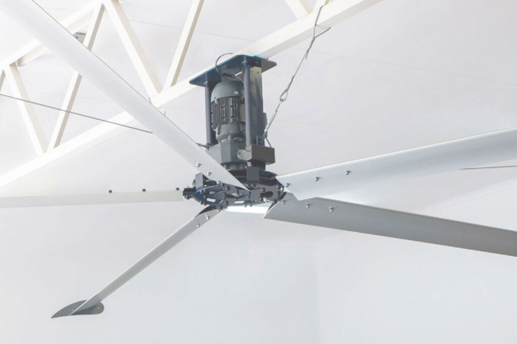 High Volume Low Speed (HVLS) fans are large, ceiling-mounted ventilation fans that turn slowly, producing continuous air columns that move gently downwards and then outwards. This creates a natural cooling and ventilation effect which people experience as feeling up to 8°C cooler. Rather than adding thermal energy to the air or removing it, HVLS fans move large masses of air and enhance destratification and evaporation.